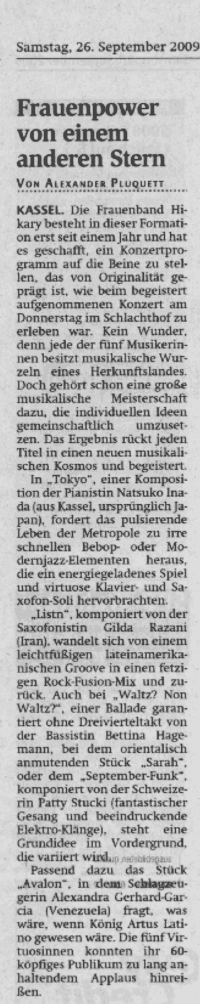 Kassel. Die Frauenband Hikary besteht in dieser Formation erst seit einem Jahr und hat es geschafft, ein Konzertprogramm auf die Beine zu stellen, das von Originalität geprägt ist, wie beim begeistert aufgenommenen Konzert am Donnerstag im Schlachthof zu erleben war. Kein Wunder, denn jede der fünf Musikerinnen besitzt musikalische Wurzeln eines Herkunftslandes. Doch gehört schon eine große musikalische Meisterschaft dazu, die individuellen Ideen gemeinschaftlich umzusetzen. Das Ergebnis rückt jeden Titel in einen neuen musikalischen Kosmos und begeistert.